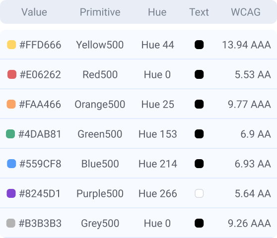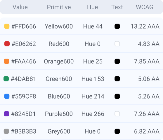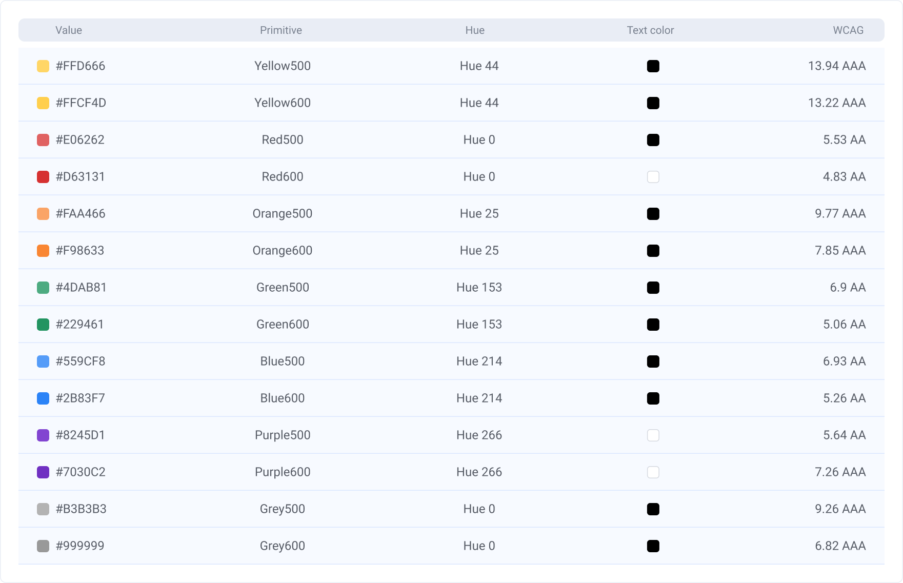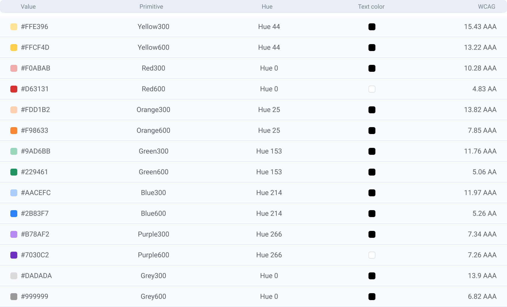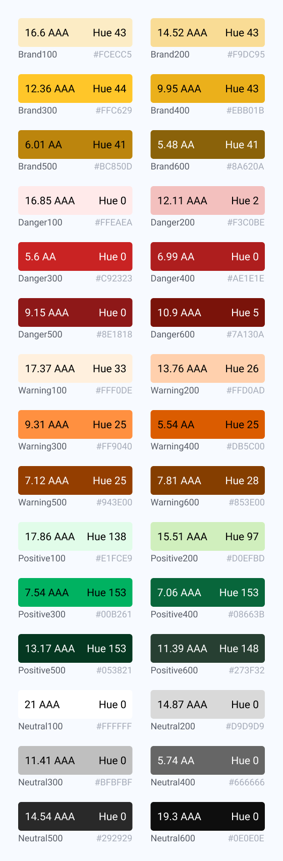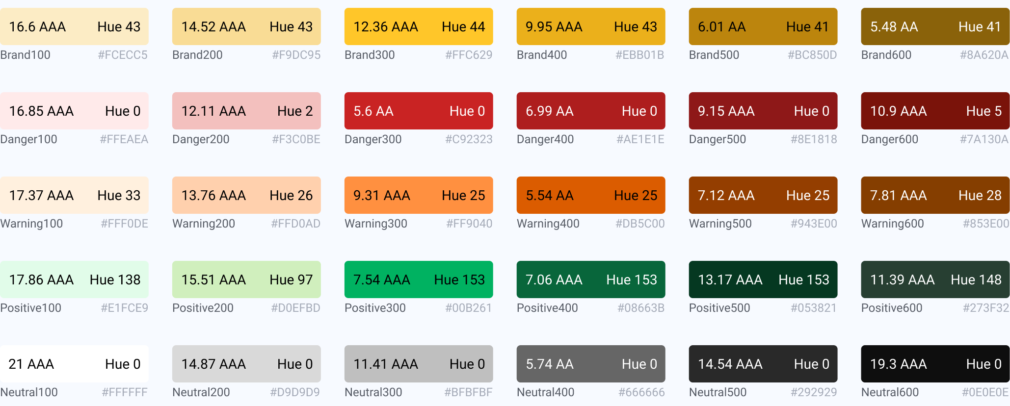 The revised scales were constructed with accessibility criteria embedded from the outset, validating contrast performance across key use cases (text-on-color and color-on-color) and ensuring compliance with established standards.