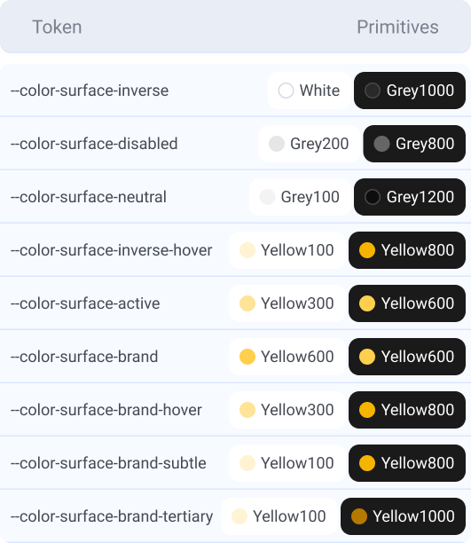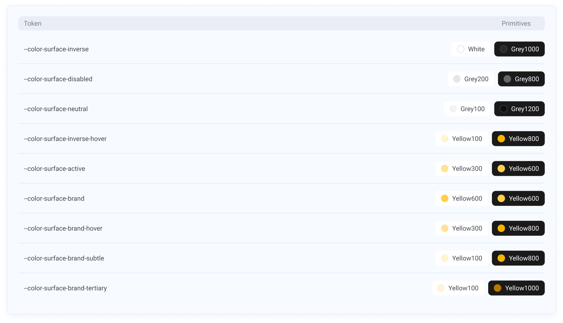 Tokens were structured to maintain parity between Light and Dark modes through mirrored semantic logic, allowing contextual adaptation without altering the underlying primitive scales.