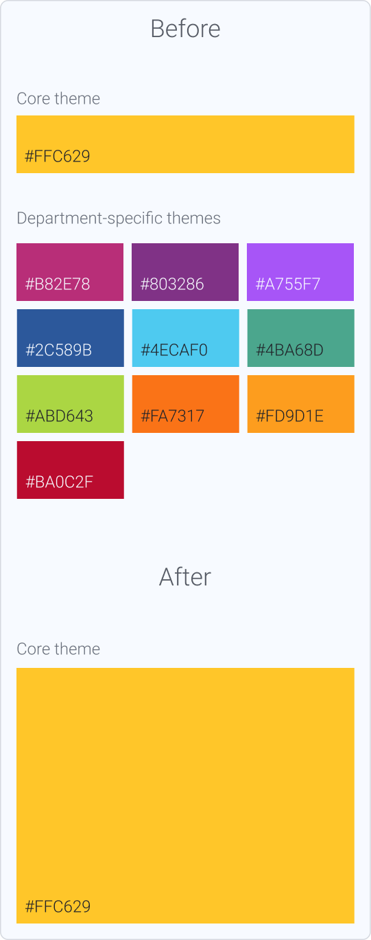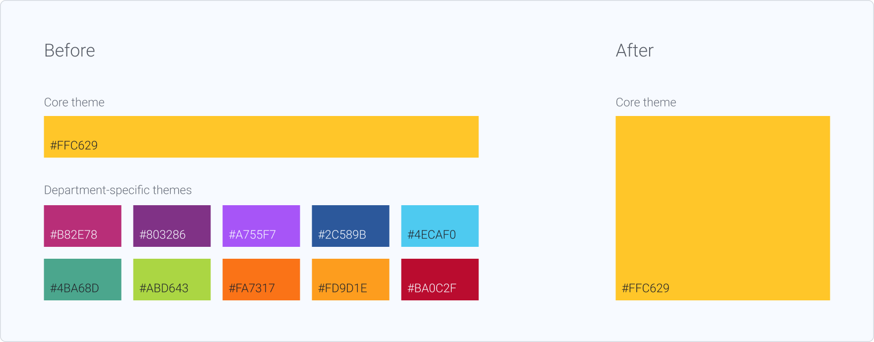 Before initiating the refactor, we defined a consolidation strategy: maintaining a single “Core” theme based on the company’s official brand colors. This decision eliminated the need to revise the remaining 11 department-specific themes and reduced structural complexity within the system.